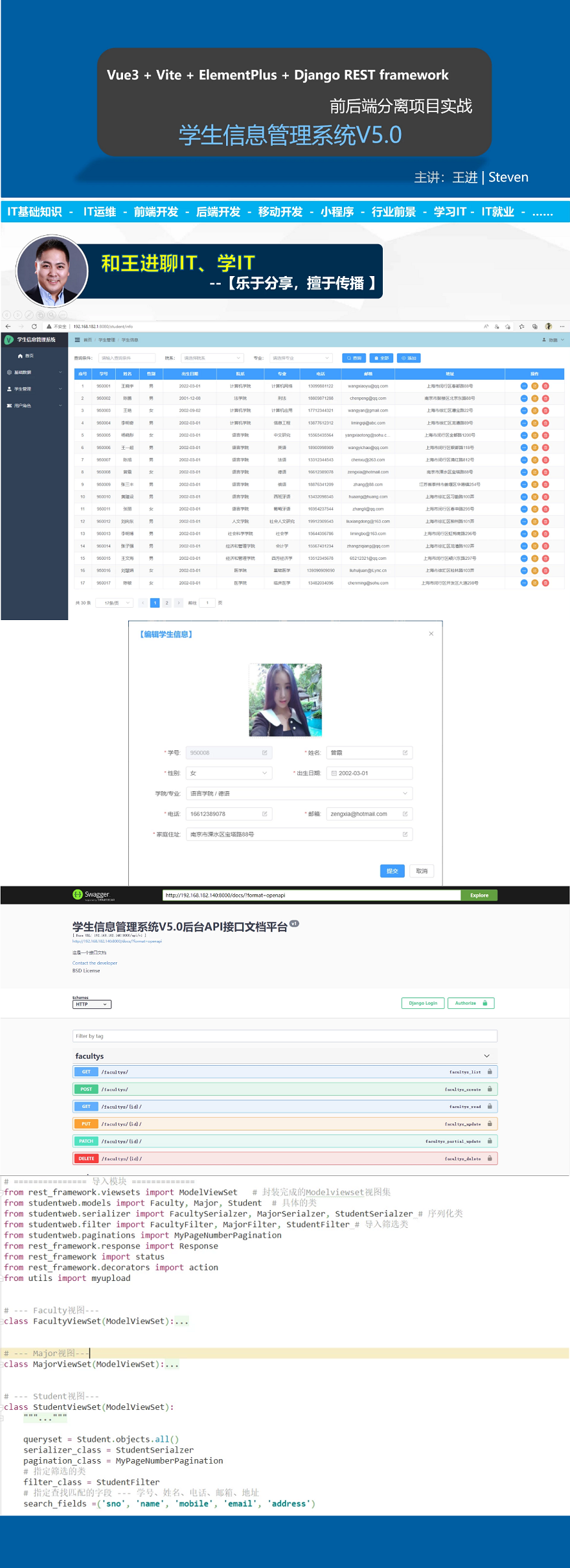 本季課程主學生信息管理系統V5.0,內容包含:Django REST framework安裝和項目初始化、數據的序列化、ViewSet視圖集、DefaultRouter路由類、django-filter實現過濾、rest framework實現查找、rest framework實現分頁、npm的使用、使用Vite構建vue3項目、Package.json解析、ElementPlus安裝和應用、vue-router實現路由、使用Vuex的store對象、后臺管理系統主界面的布局、axios組件的安裝和請求、axios請求的模塊化、請求攔截器和響應攔截器、使用el-select實現聯級下拉、使用cascader實現聯級選擇、vue表單的驗證、實現學生信息的添加、修改和刪除、實現文件的上傳等等功能