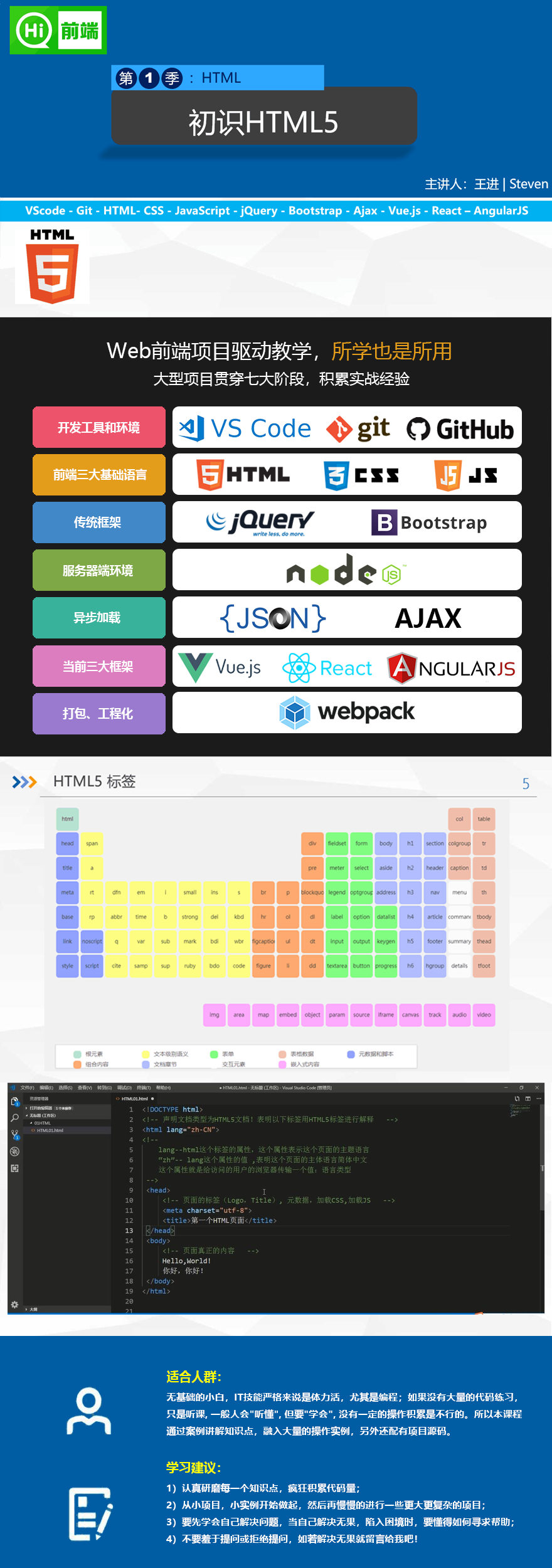 課程內(nèi)容包括:前后端技術(shù)的討論,VS Code的安裝和使用,Git的使用,如何上傳代碼到GitHub,HTML5的基本語法,HTML基礎(chǔ)標(biāo)簽,什么是列表、表格和表單等,課程內(nèi)容融入實戰(zhàn)案例教學(xué),積累實戰(zhàn)經(jīng)驗。