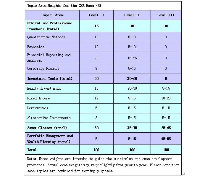 道德和職業(yè)標(biāo)準(zhǔn)、投資評估和管理的工具和因素(含定量分析方法、經(jīng)濟(jì)學(xué)、財(cái)務(wù)報(bào)表分析及公司金融)、資產(chǎn)評估(包含股票、固定收益產(chǎn)品、衍生產(chǎn)品及另類投資產(chǎn)品)、投資組合管理及投資表現(xiàn)報(bào)告。