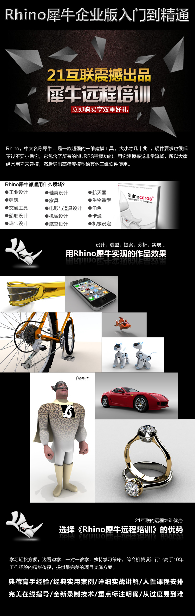 Rhino,中文名稱犀牛,是一款超強(qiáng)的三維建模工具,它包含了所有的NURBS建模功能,用它建模感覺非常流暢,但它又絕不只能用來建模,在渲染等方面也有其獨(dú)到的特色。在本套21互聯(lián)制作的犀牛企業(yè)版視頻教程中,房老師就會帶領(lǐng)大家從軟件的基本認(rèn)識、到二維三維模型建設(shè)、再到更廣泛的領(lǐng)域的使用和實(shí)例,幫助大家更快更好的掌握它。
