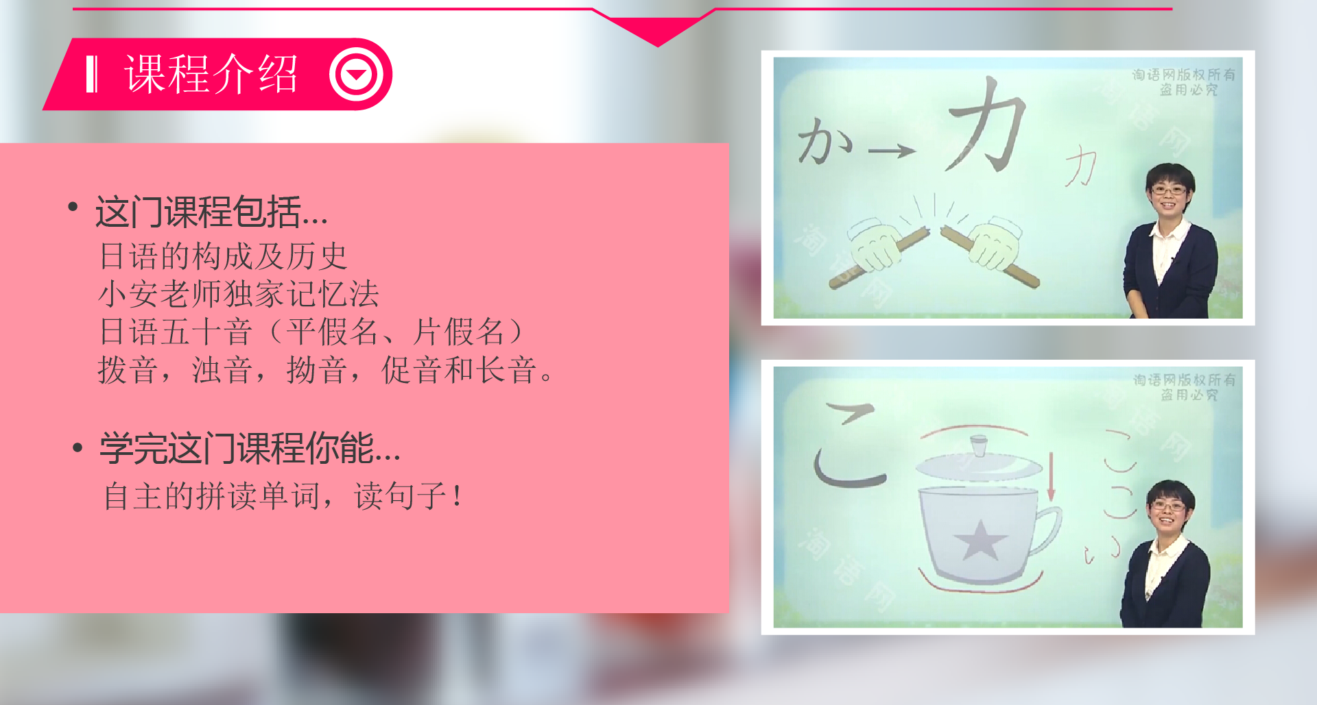 課程特色:獨創(chuàng)平片假名記憶法,通過各種奇思妙想,輕松記憶;結合練習,快樂學習。