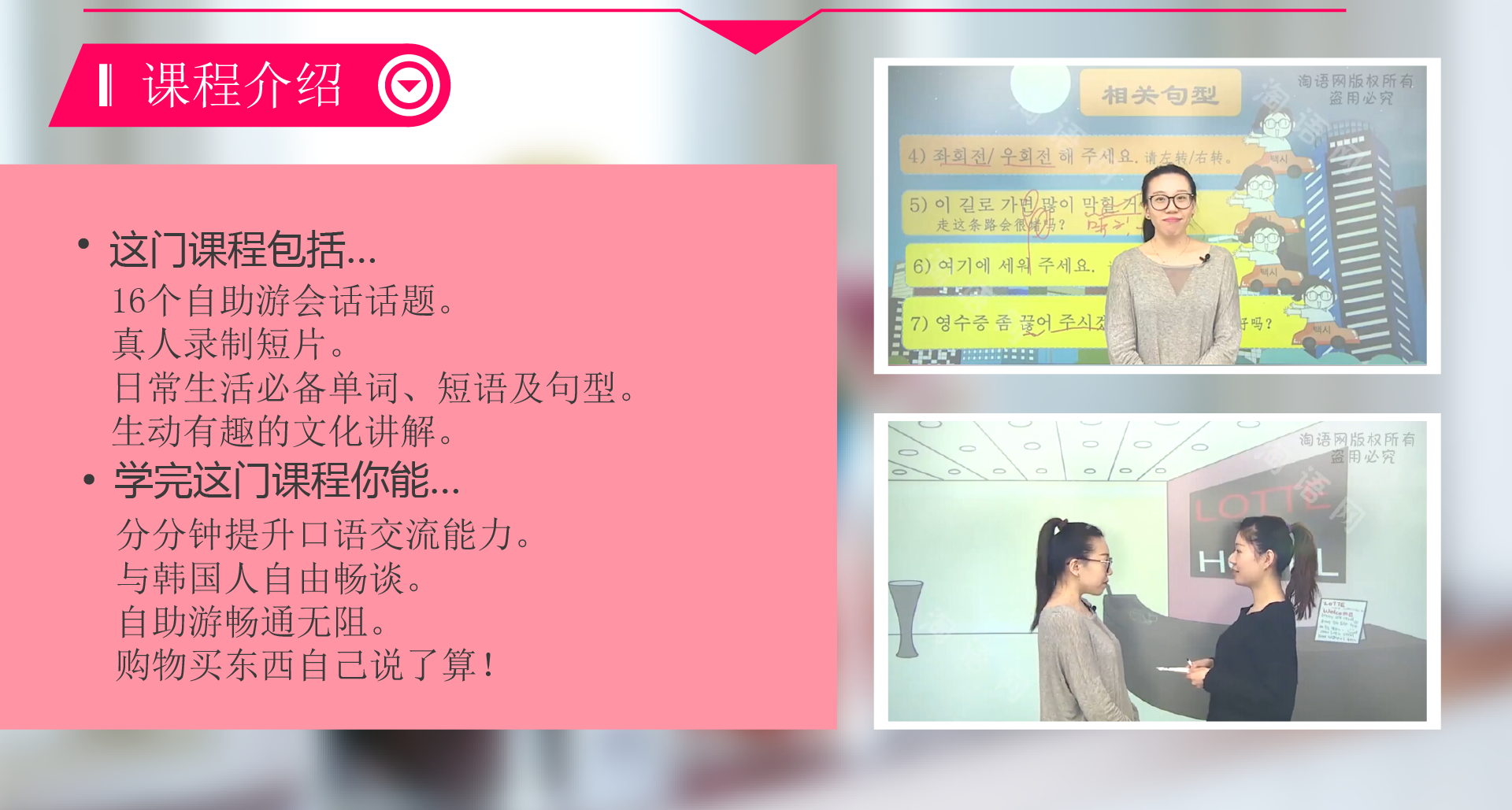 ? ? ? ? ? ? 本課程包括韓語發(fā)音+韓語初級(jí)上+韓語初級(jí)下+韓語旅游實(shí)用會(huì)話課,內(nèi)容多多,值得你擁有哦!