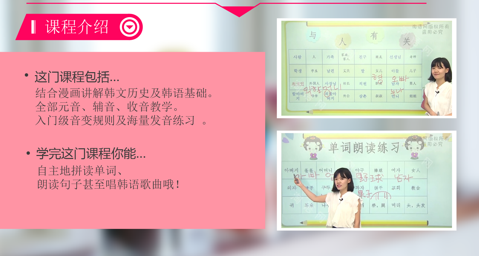 內(nèi)容簡(jiǎn)介:?想從小白變身成外語大人嗎?想從學(xué)渣逆襲成學(xué)霸嗎?想不想在韓企面前不再望而卻步呢?那就快讓千之葉淘語網(wǎng)名師春媚老師和藝藝?yán)蠋?/span>帶你一起學(xué)習(xí)吧!