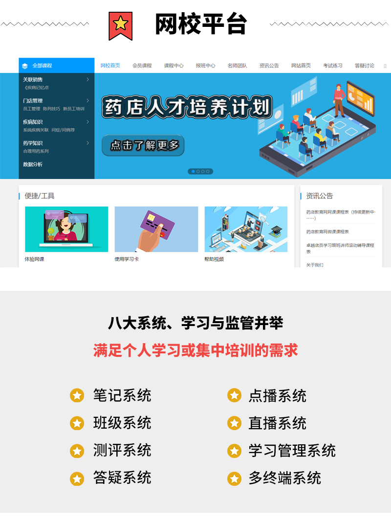 ?????經過多年的積累與沉淀,藥店教育網有豐富的課程資源,完善的功能,能完全實現(xiàn):員工隨時隨地通過電腦或手機學習優(yōu)質的課程;通過課后練習鞏固課程知識點;通過考試系統(tǒng)測評學習效果;通過在線答疑系