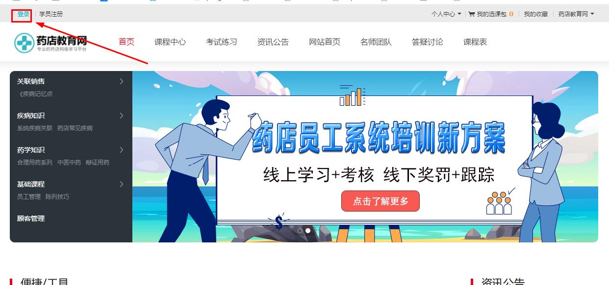 1、進(jìn)入藥店教育網(wǎng)網(wǎng)校平臺(tái),登陸您的學(xué)習(xí)賬號(hào)及密碼