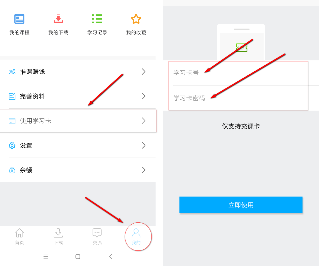 注:每個學(xué)習(xí)卡僅能使用一次,使用成功后,點(diǎn)擊“我的課程”,可查看學(xué)習(xí)課程的方式介紹。