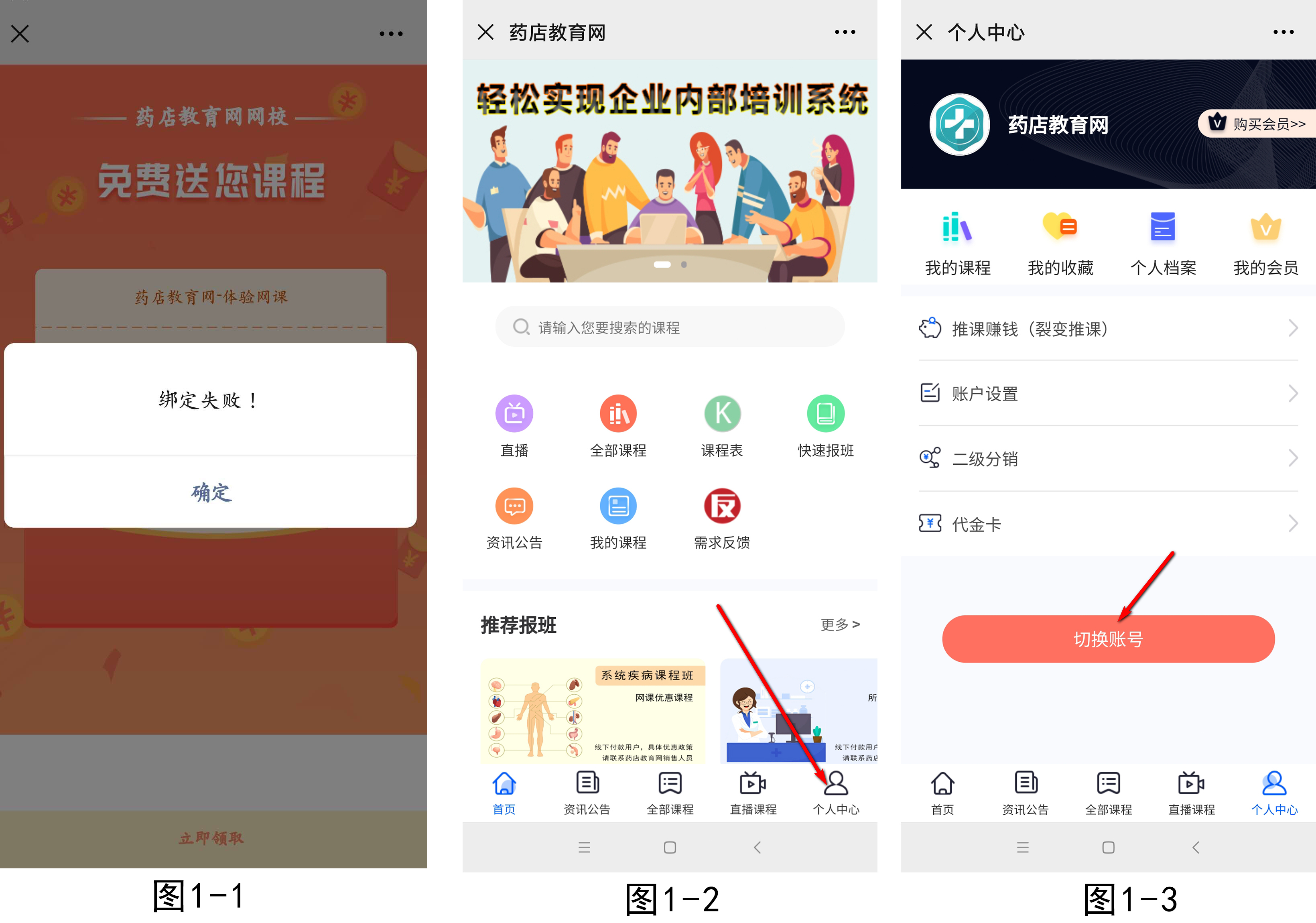 領(lǐng)取免費(fèi)課程如果出現(xiàn)“綁定失敗”,如1-1圖所示,請(qǐng)?jiān)谖⑿胖?打開藥店教育網(wǎng)網(wǎng)校wap版本,點(diǎn)擊“個(gè)人中心”,如果1-2,然后點(diǎn)擊“切換賬號(hào)”,如果1-3,然后關(guān)閉這個(gè)頁(yè)面,回到二維碼,重新識(shí)別,登陸領(lǐng)取,即可成功。