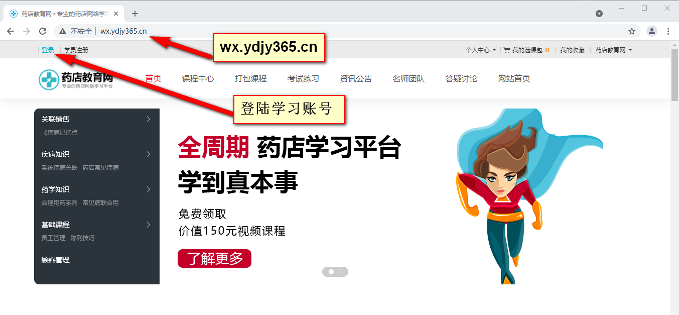 1、打開(kāi)藥店教育網(wǎng)校平臺(tái):http://wx.ydjy365.cn,點(diǎn)擊“登陸”,在彈出的登錄框中登陸您的賬號(hào)及密碼(藥店教育網(wǎng)代注冊(cè)的賬號(hào)與密碼相同。),如下圖所示: