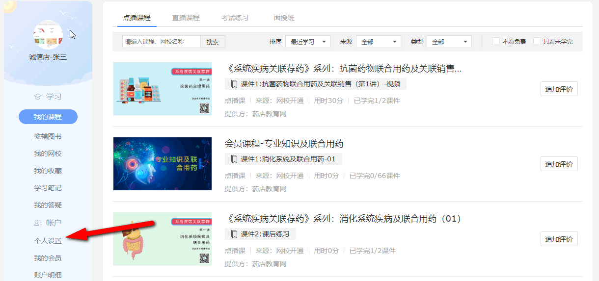 2、登陸完成后,機(jī)會(huì)跳轉(zhuǎn)到藥店教育網(wǎng)校首頁(yè)。您可以點(diǎn)擊右上角的“個(gè)人中心”(小人頭像),然后進(jìn)入個(gè)人中心;如下圖所示:
