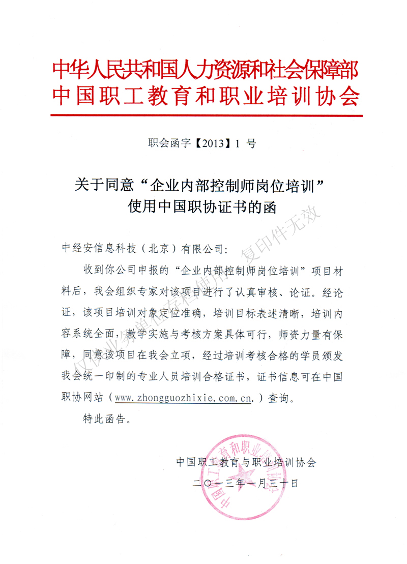 人社部中國職協(xié)企業(yè)內(nèi)部控制師崗位培訓項目證明 |