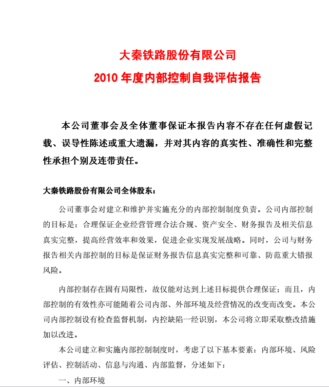大秦鐵路股份有限公司2010年度內(nèi)部控制自我評估報告