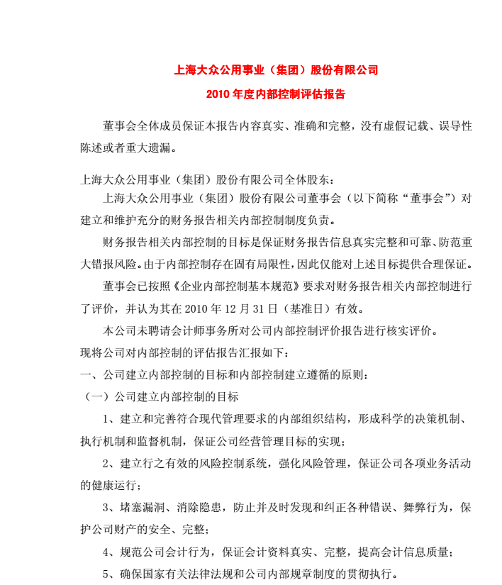 大眾公用2010年度內(nèi)部控制評估報告2011-4-15