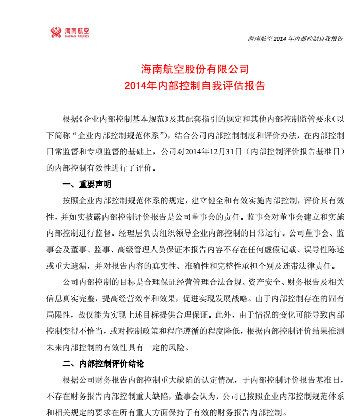 海南航空2014年內部控制自我評估報告2015-3-26
