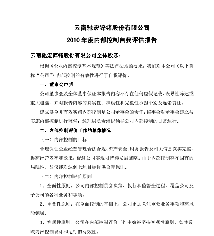 云南馳宏鋅鍺股份有限公司2010年度內(nèi)部控制自我評(píng)估報(bào)告