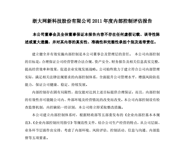 浙大網(wǎng)新2011年度內(nèi)部控制評估報告2012-4-25