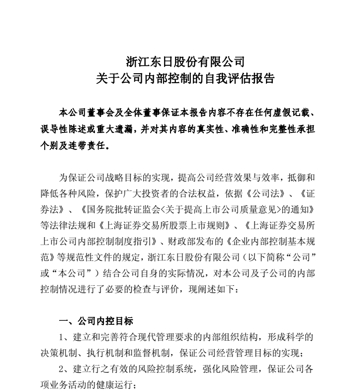 浙江東日股份有限公司關(guān)于公司內(nèi)部控制的自我評估報(bào)告