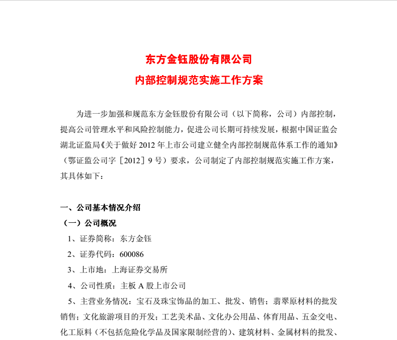 東方金鈺股份有限公司內(nèi)部控制規(guī)范實(shí)施工作方案2012年