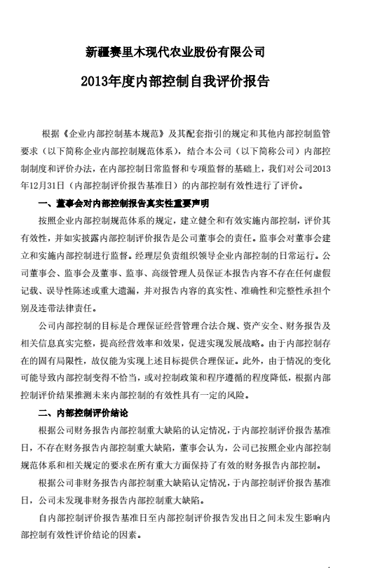 新賽股份2013年度內(nèi)部控制自我評(píng)價(jià)報(bào)告2014-4-30