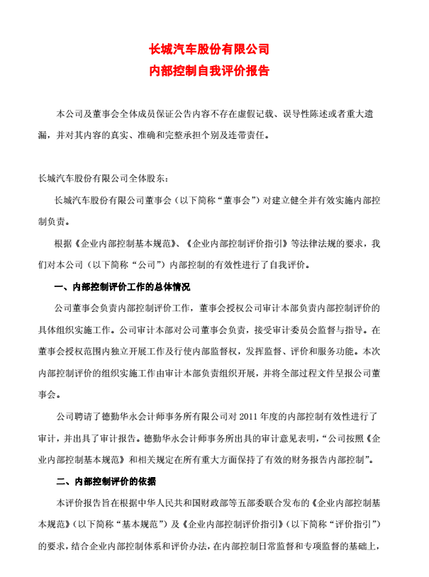 長城汽車股份有限公司內(nèi)部控制自我評價報告