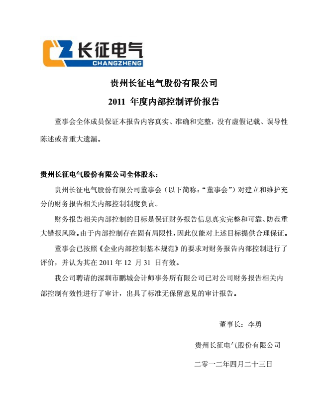 長(zhǎng)征電氣2011年度內(nèi)部控制評(píng)價(jià)報(bào)告2012-4-25