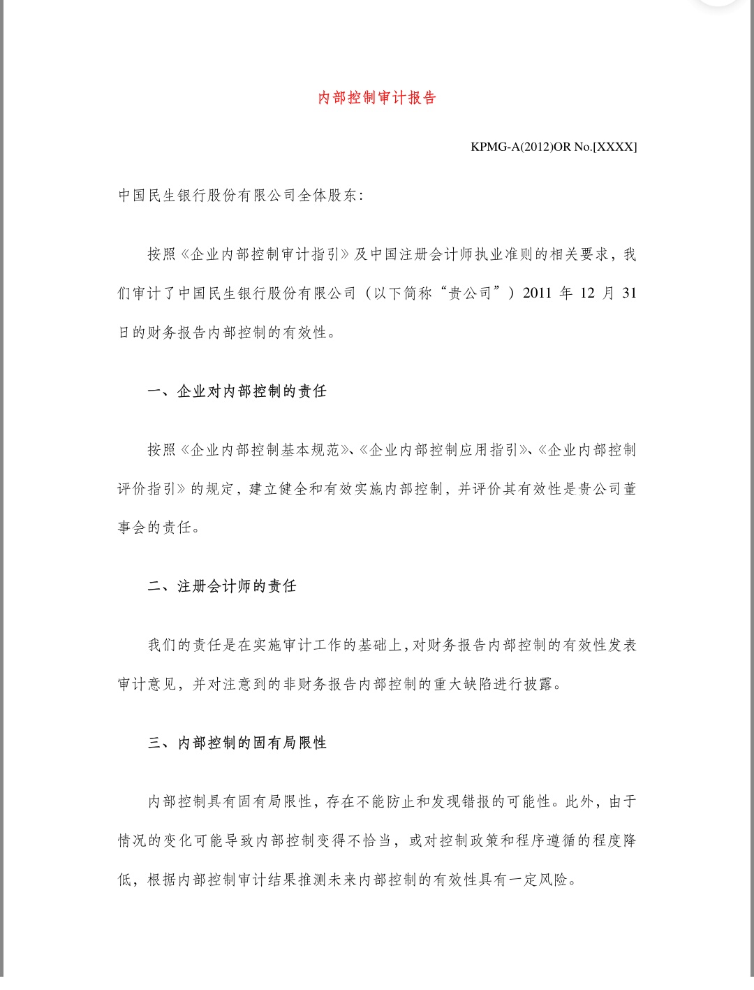中國民生銀行股份有限公司 內(nèi)部控制審計報告2012年