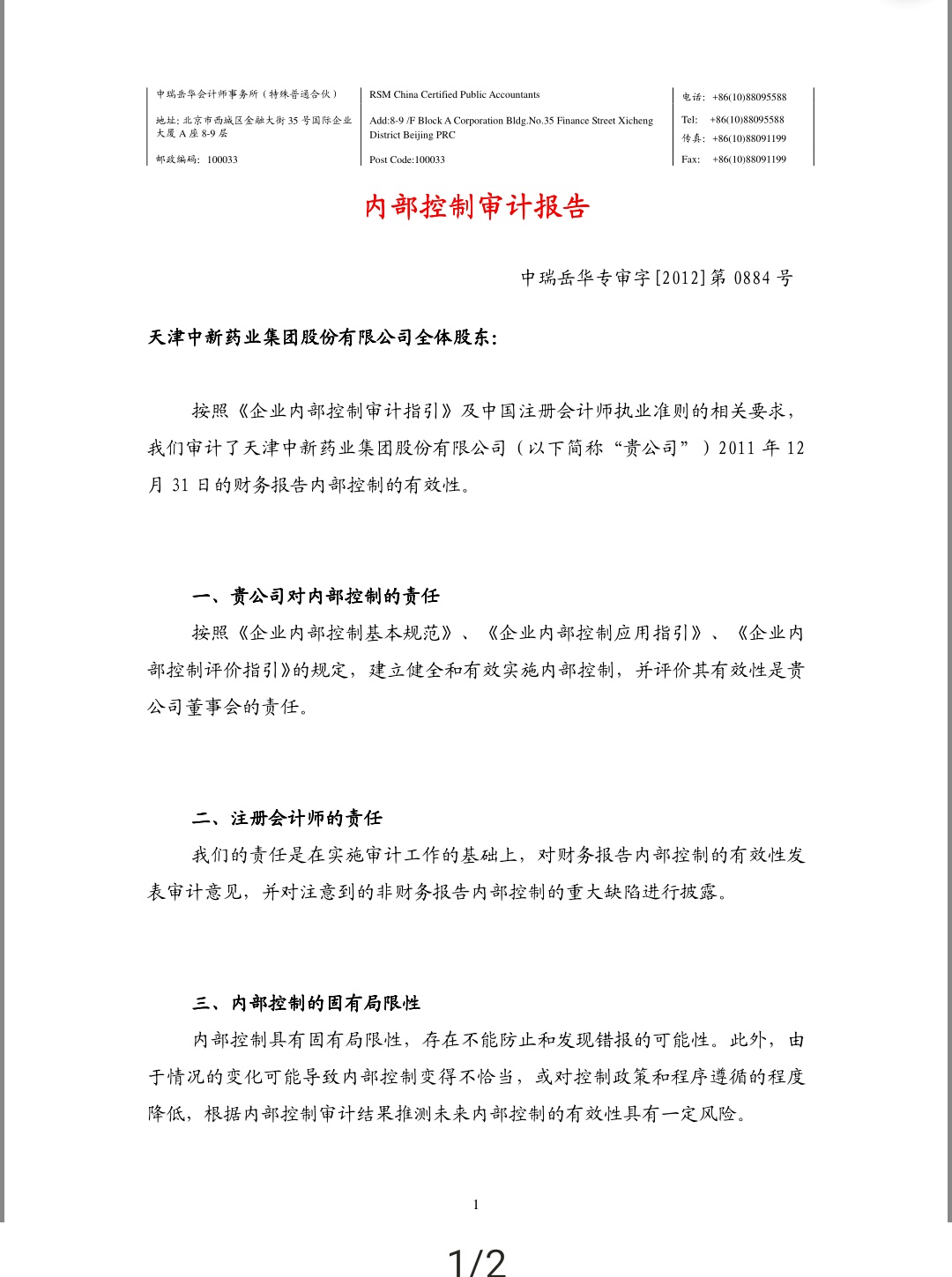 內(nèi)部控制審計報告2012年天津中新藥業(yè)集團(tuán)股份有限公司