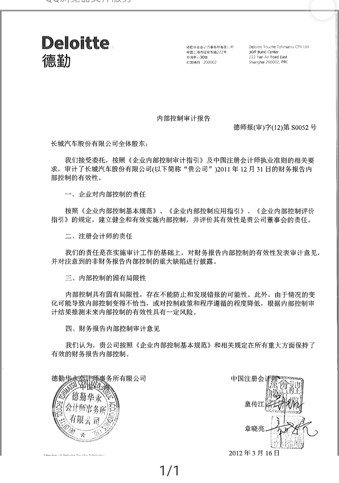 長城汽車股份有限公司內(nèi)部控制審計報告