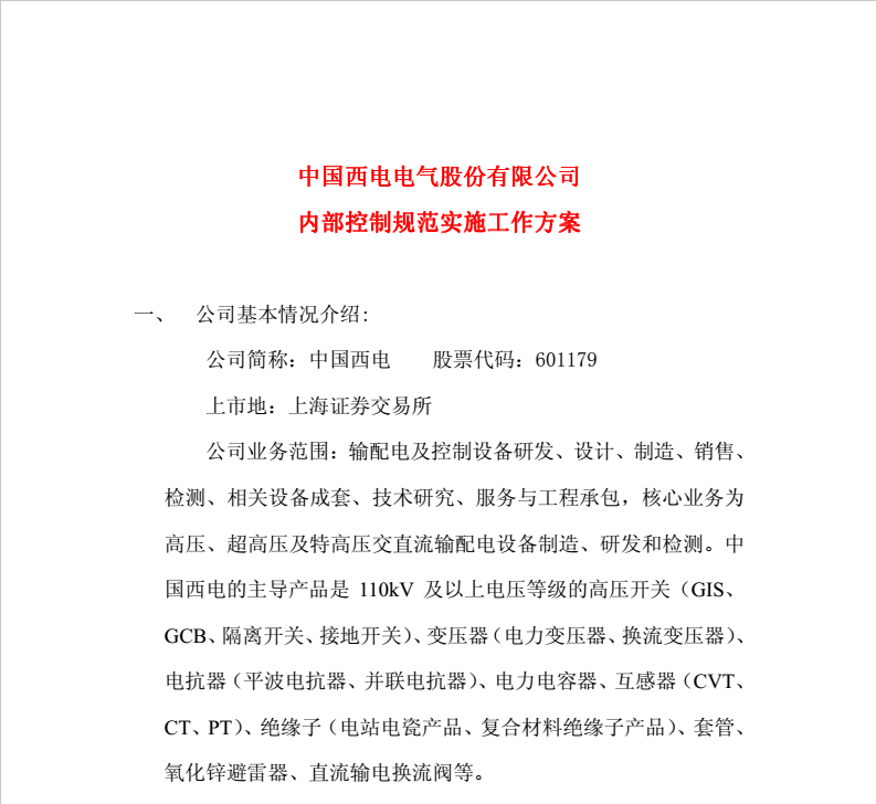 中國西電電氣股份有限公司內(nèi)部控制規(guī)范實施工作方案