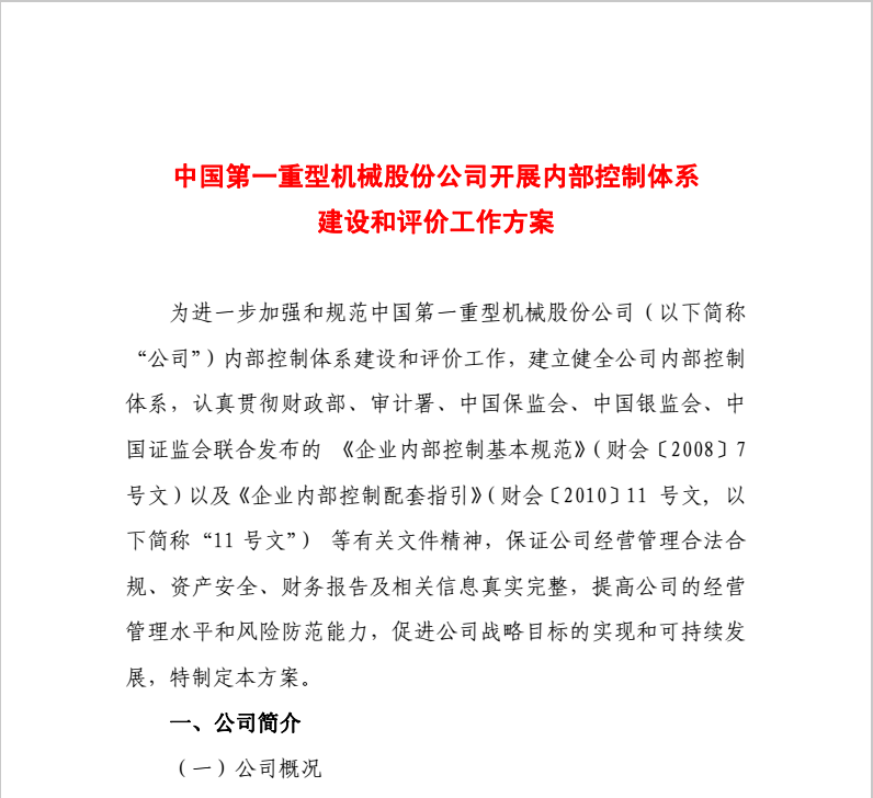 中國一重開展內(nèi)部控制體系建設(shè)和評(píng)價(jià)工作方案2012-3-31
