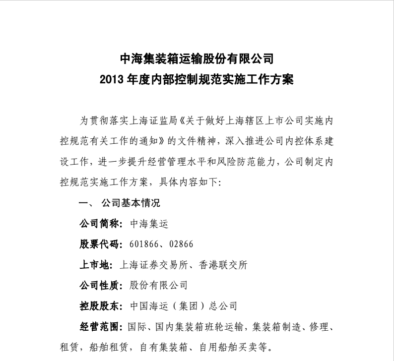 中海集運(yùn)2013年度內(nèi)部控制規(guī)范實(shí)施工作方案2013-3-27
