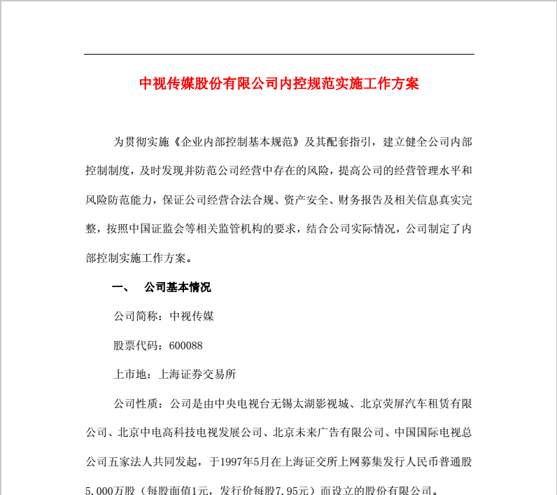 中視傳媒股份有限公司內控規(guī)范實施工作方案