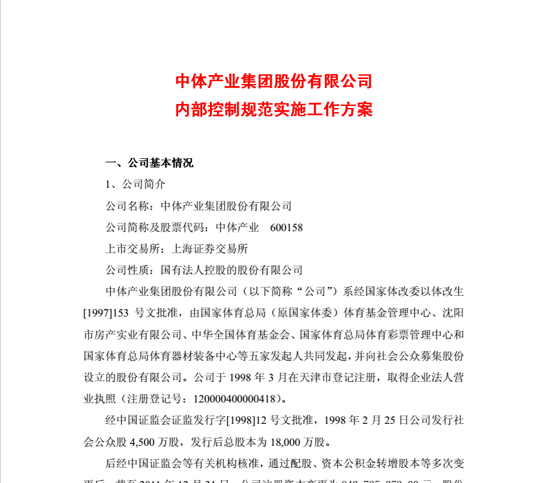 中體產(chǎn)業(yè)集團股份有限公司內(nèi)部控制規(guī)范實施工作方案
