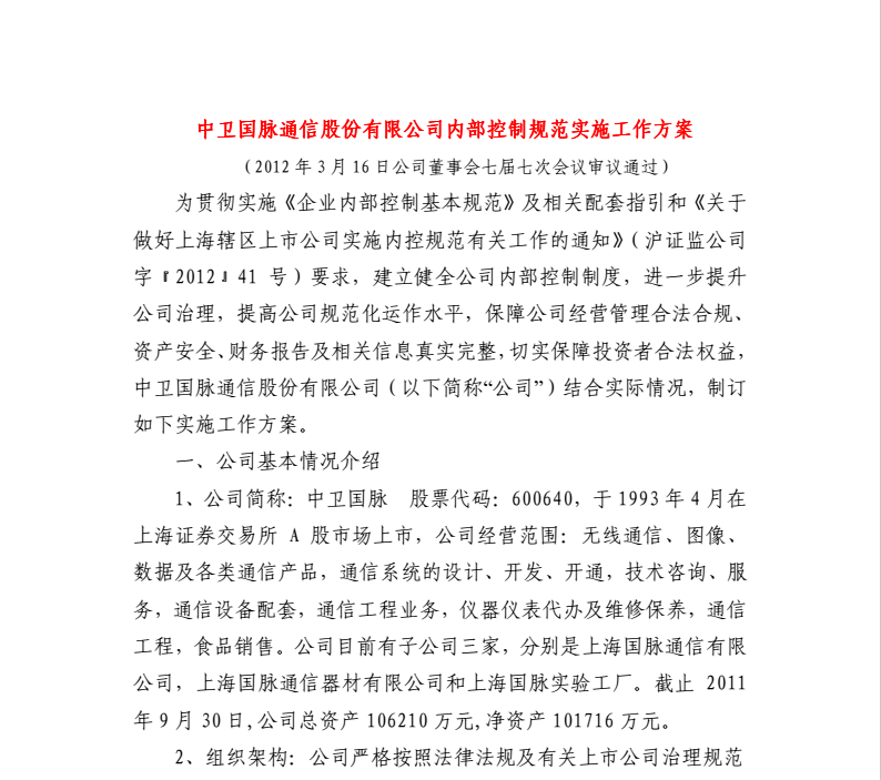 中衛(wèi)國脈通信股份有限公司內部控制規(guī)范實施工作方案