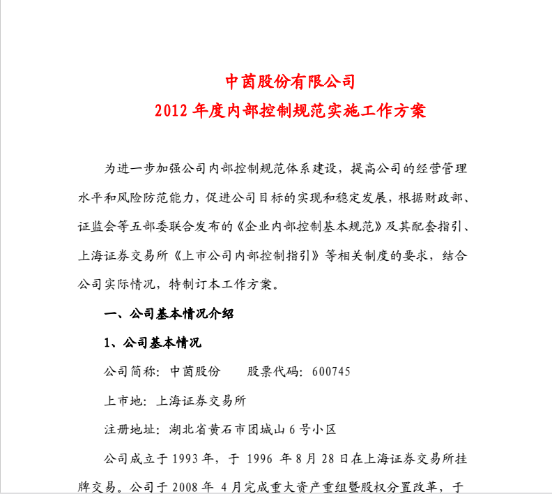 中茵股份有限公司2012年度內(nèi)部控制規(guī)范實施工作方案