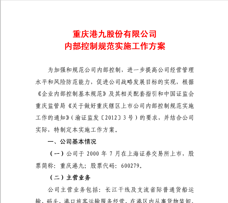 重慶港九股份有限公司內(nèi)部控制規(guī)范實(shí)施工作方案