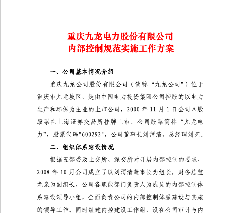 重慶九龍電力股份有限公司內(nèi)部控制規(guī)范實施工作方案