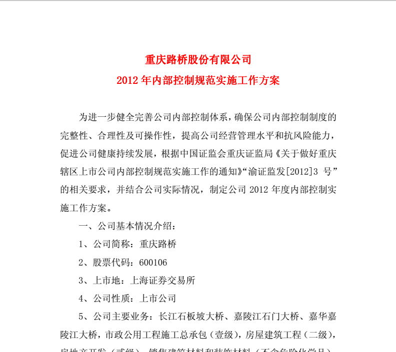 重慶路橋2012年內(nèi)部控制規(guī)范實(shí)施工作方案2012-3-31