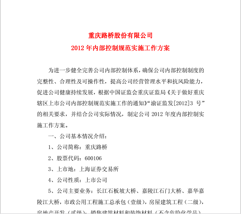 重慶路橋股份有限公司2012年內(nèi)部控制規(guī)范實(shí)施工作方案