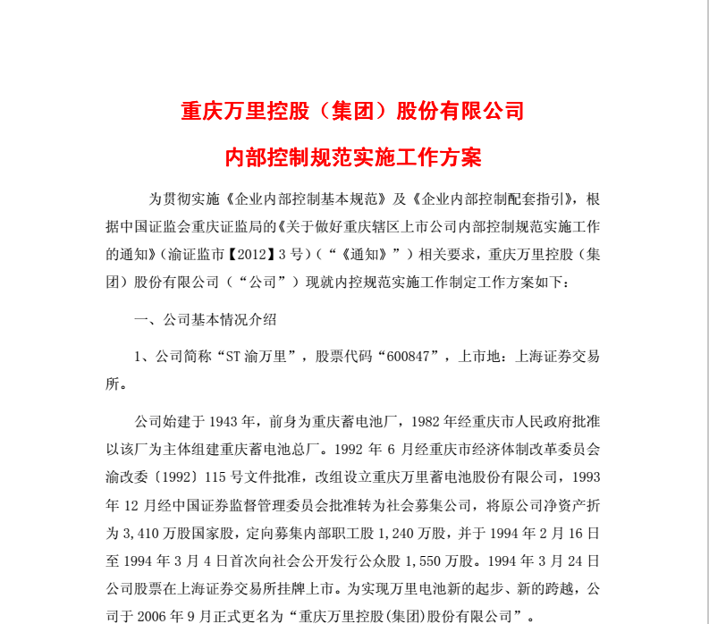 重慶萬里控股(集團(tuán))股份有限公司內(nèi)部控制規(guī)范實(shí)施工作方案