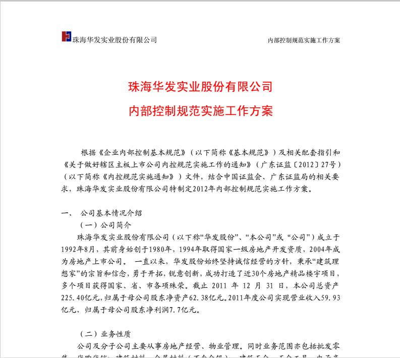 珠海華發(fā)實業(yè)股份有限公司內(nèi)部控制規(guī)范實施工作方案