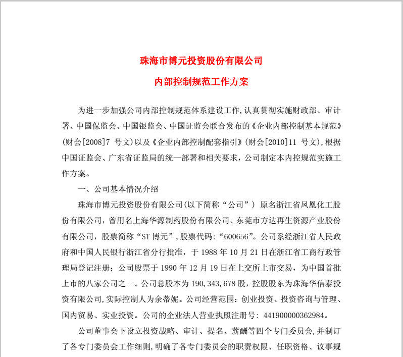 珠海市博元投資股份有限公司內(nèi)部控制規(guī)范工作方案
