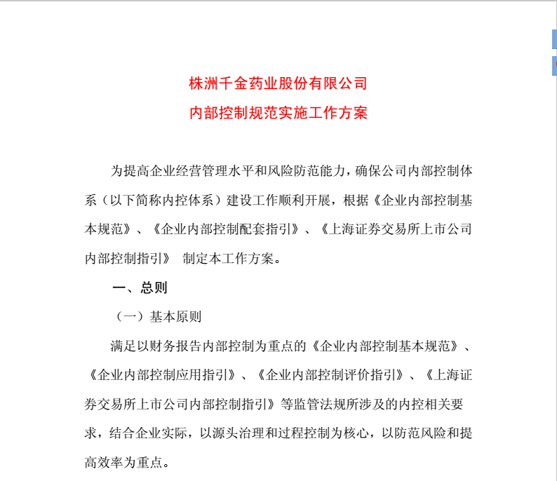 株洲千金藥業(yè)股份有限公司內(nèi)部控制規(guī)范實(shí)施工作方案