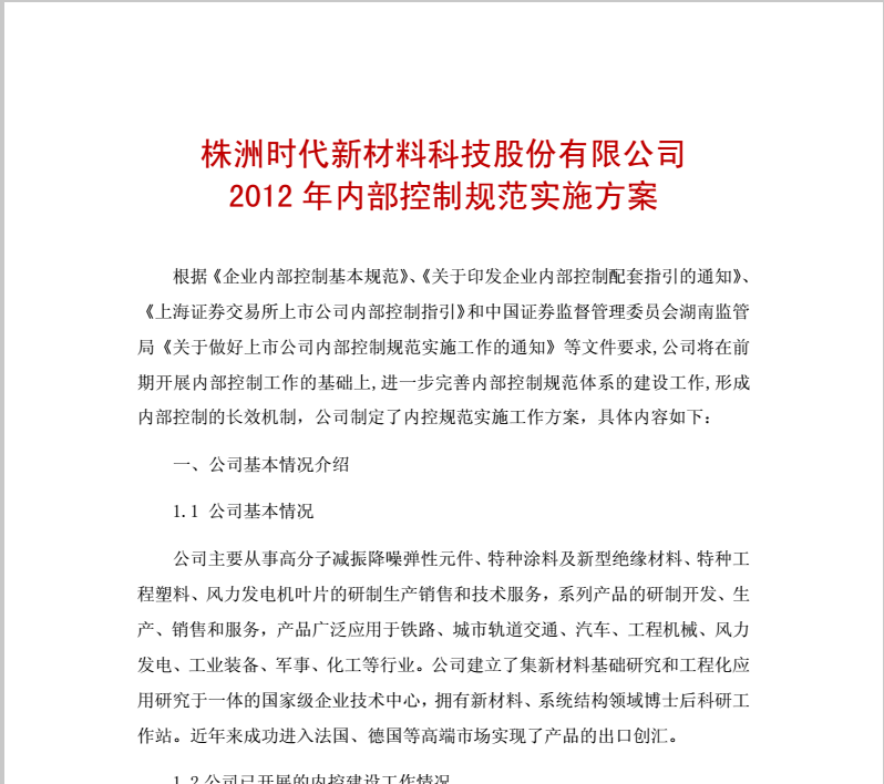 株洲時代新材料科技股份有限公司2012年內(nèi)部控制規(guī)范實施方案