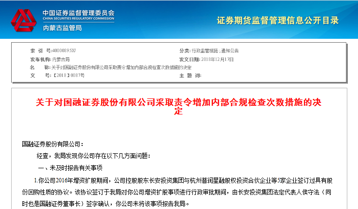 12月17日,國(guó)融證券股份有限公司因未及時(shí)報(bào)告有關(guān)事項(xiàng)、內(nèi)部控制不健全及合規(guī)風(fēng)控不到位的違規(guī)行為,被內(nèi)蒙古證監(jiān)局采取責(zé)令增加內(nèi)部合規(guī)檢查的次數(shù)并提交合規(guī)檢查報(bào)告”的規(guī)定。