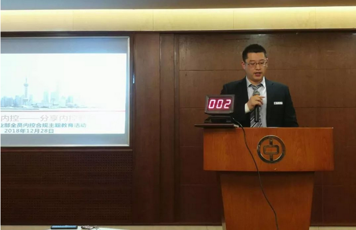 2018年12月28日晚,中國銀行上海分行營業(yè)部在五樓的多功能廳舉辦了以內(nèi)控合規(guī)為主題的“說內(nèi)控、唱內(nèi)控——分享內(nèi)控新感受”的營業(yè)部全員教育活動(dòng)。在此次活動(dòng)中,行員們都積極參與,在知識(shí)競賽中積極答題,新行員李浩銘與孫嘉誠做了以內(nèi)控合規(guī)為主題的演講,多人參與進(jìn)行了案例演繹以及Bund 23小組的成員們提前錄制了內(nèi)控金曲分享給大家。