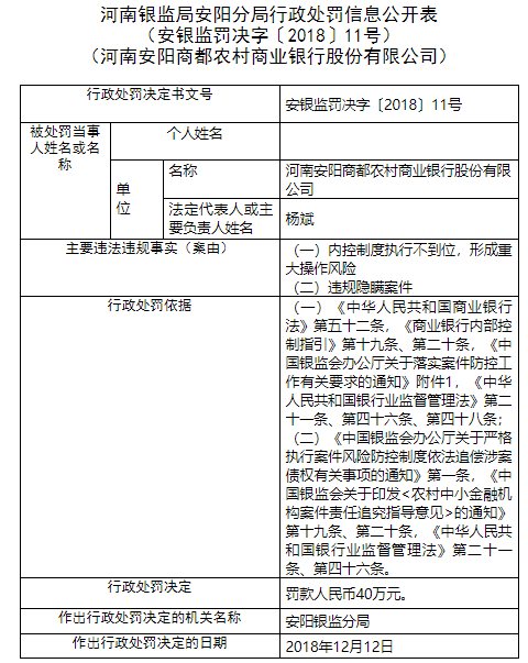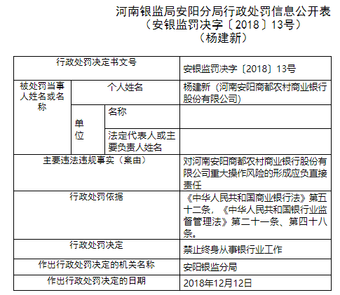1月9日消息,銀保監(jiān)會安陽監(jiān)管分局近日發(fā)布行政處罰信息顯示,河南安陽商都農(nóng)村商業(yè)銀行股份有限公司因內(nèi)控制度執(zhí)行不到位,形成重大操作風(fēng)險,違規(guī)隱瞞案件,被罰款40萬元;責(zé)任人譚建軍被取消終身董事、高級管理人員任職資格,終身禁止從事銀行業(yè)工作;責(zé)任人楊建新被終身禁止從事銀行業(yè)工作;責(zé)任人李喜合被取消終身高級管理人員任職資格。