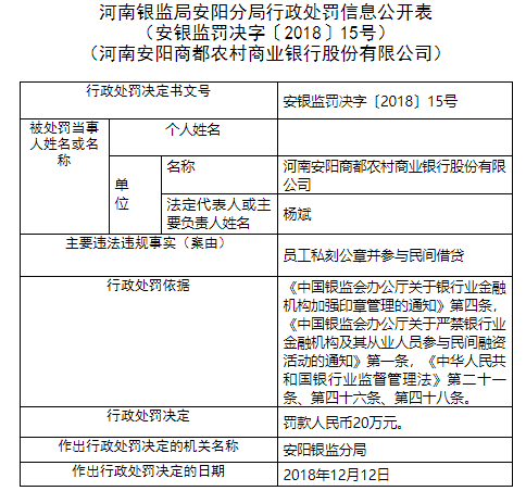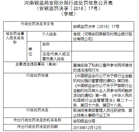 河南安陽商都農(nóng)村商業(yè)銀行股份有限公司因員工私刻公章并參與民間借貸,被罰款20萬;責(zé)任人李斌被取消終身高級管理人員任職資格,終身禁止從事銀行業(yè)工作。