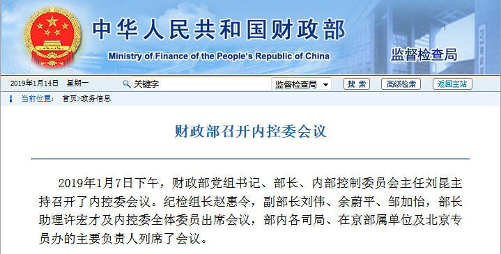 2019年1月7日下午,財政部黨組書記、部長、內(nèi)部控制委員會主任劉昆主持召開了內(nèi)控委會議。紀檢組長趙惠令,副部長劉偉、余蔚平、鄒加怡,部長助理許宏才及內(nèi)控委全體委員出席會議,部內(nèi)各司局、在京部屬單位及北京專員辦的主要負責人列席了會議。
