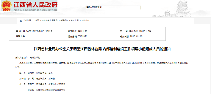 江西省林業(yè)局辦公室關(guān)于調(diào)整江西省林業(yè)局?內(nèi)部控制建設(shè)工作領(lǐng)導(dǎo)小組組成人員的通知