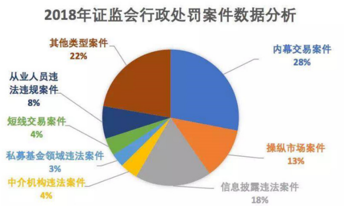 需要指出的是,上市公司僅僅是公告巨虧,并非違法行為。上市公司及其高管如借商譽減值之機違法違規(guī)操作的,可能引發(fā)針對虛假陳述、內幕交易、操縱證券、期貨市場等違法行為的行政處罰。在證券監(jiān)管實踐中,前述幾類違法行為是證監(jiān)會查處的重點。根據證監(jiān)會官方公布的數據,2018年證監(jiān)會全年作出行政處罰決定310件,罰沒款金額106.41億元,市場禁入50人。下圖為2018年證監(jiān)會行政處罰案件數據分析圖。